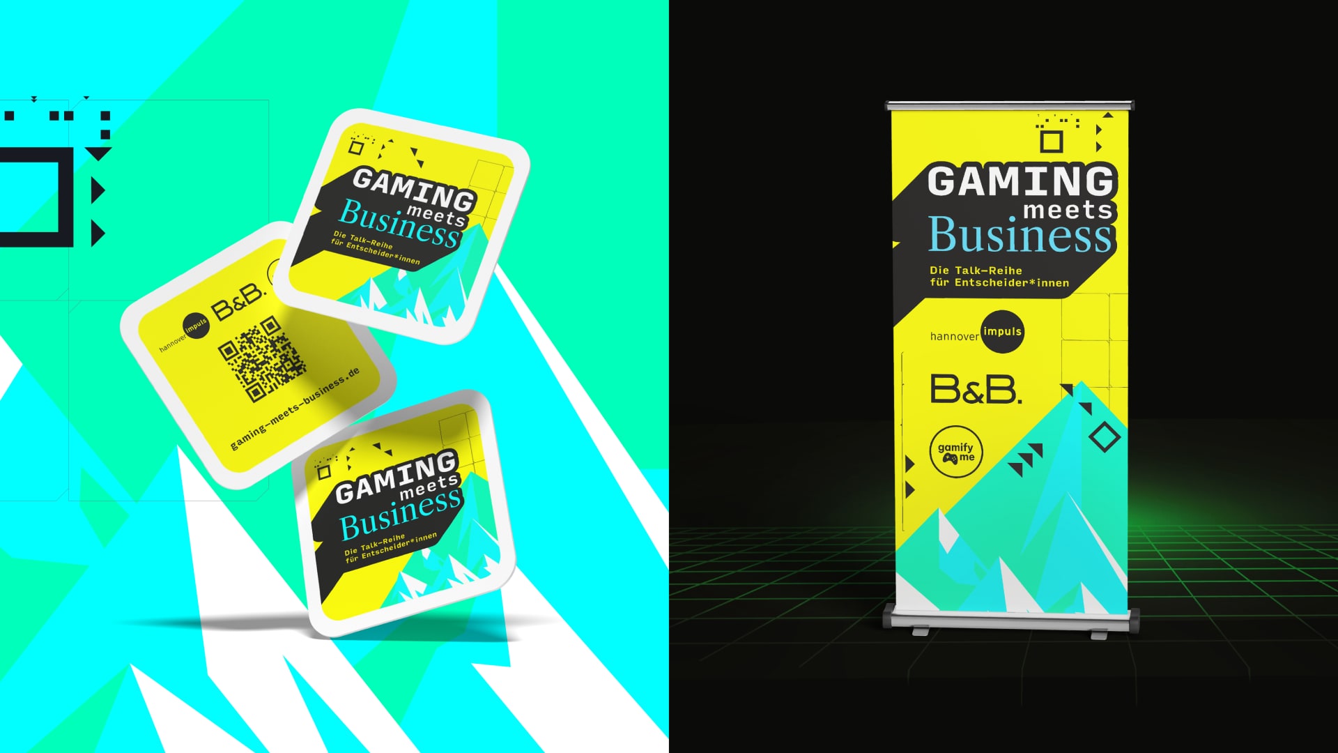 B&B. hat das gesamte Branding konzipiert: Logo, Corporate Design und alle Anwendungen. Das Design trägt den Charakter des Formats: RGB-Farben in leuchtendem Gelb und Cyan, geometrische Muster mit Gaming-Referenzen, und eine Typografie, die Energie und Präzision vereint. Digitale Direktheit trifft auf Netzwerk-Atmosphäre – eine visuelle Sprache, die auch Menschen anspricht, die Gaming bisher nicht auf dem Radar hatten.